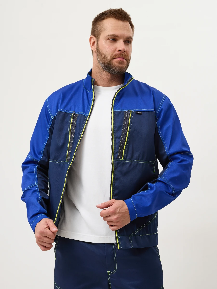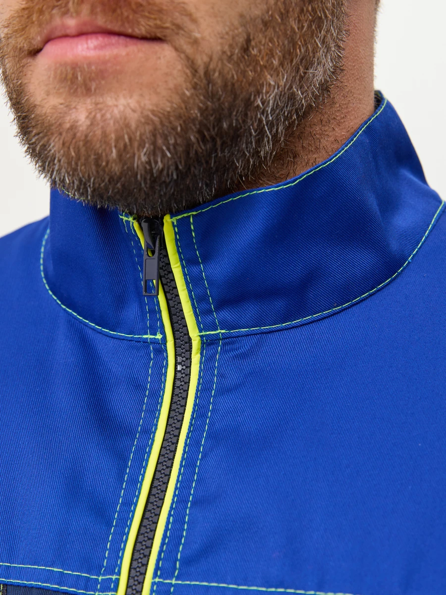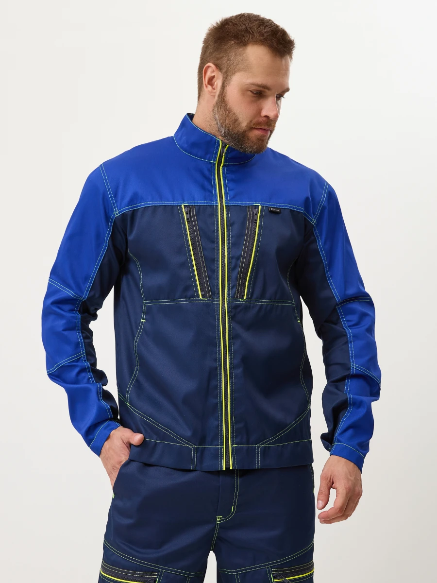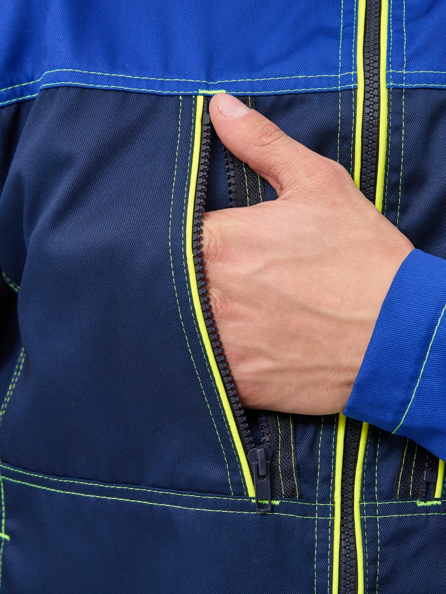 Куртка - центральная застежка на молнию-трактор - воротник стойка - 2 нижних боковых кармана, 2 нагрудных с боковым входом и застежкой на молнию трактор - по верху полочек и спинки кокетки - спинка с фигурным низом - эргономичные комбинированные рукава с застежкой на металлические кнопки. Настрочные налокотники с вытачками - лимонный светоотражающий кант вдоль центральной молнии, молний верхних карманов и нижней кокетки спинки - все участки, подверженные нагрузке, усилены закрепками Ткань: состав 35% хл. 65% пэ, плотность: 240 г/м2, пропитка ВО Цвет: васильковый,синий