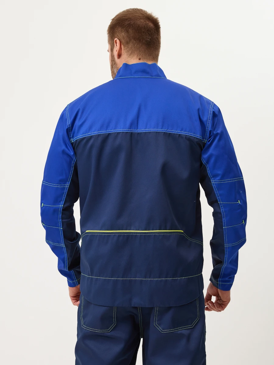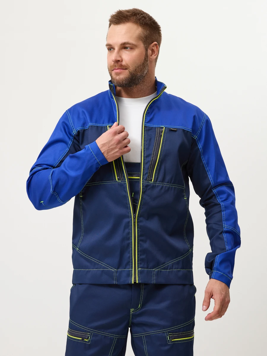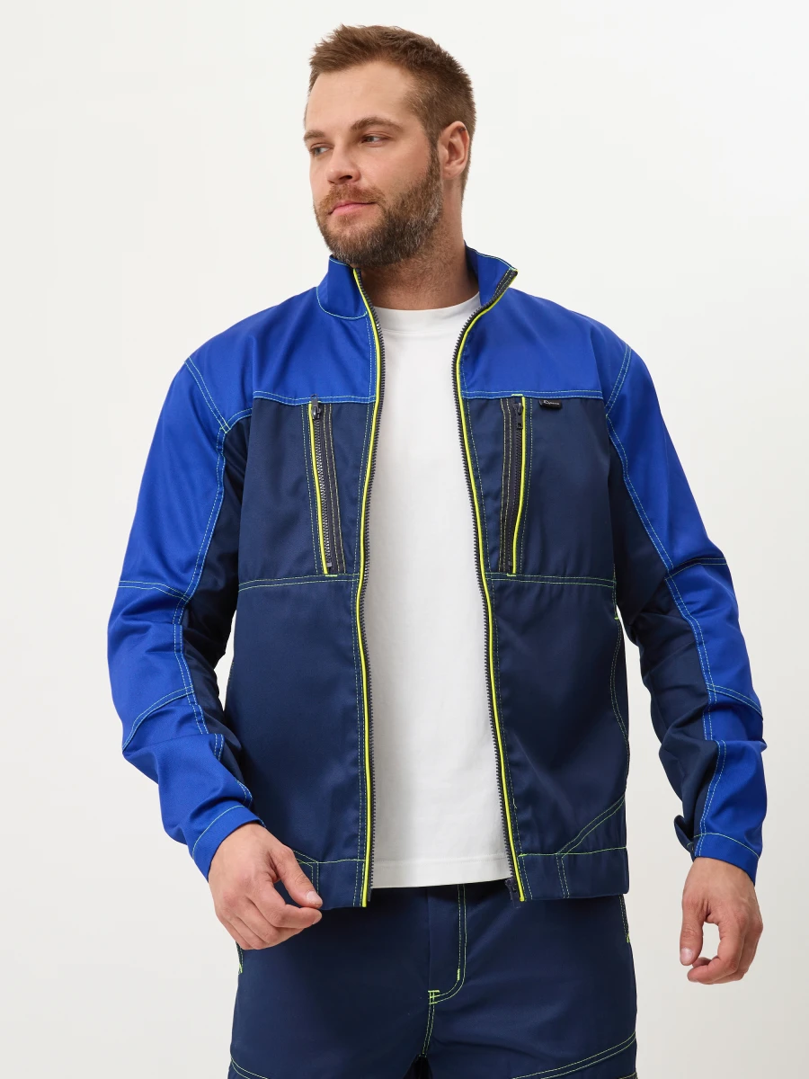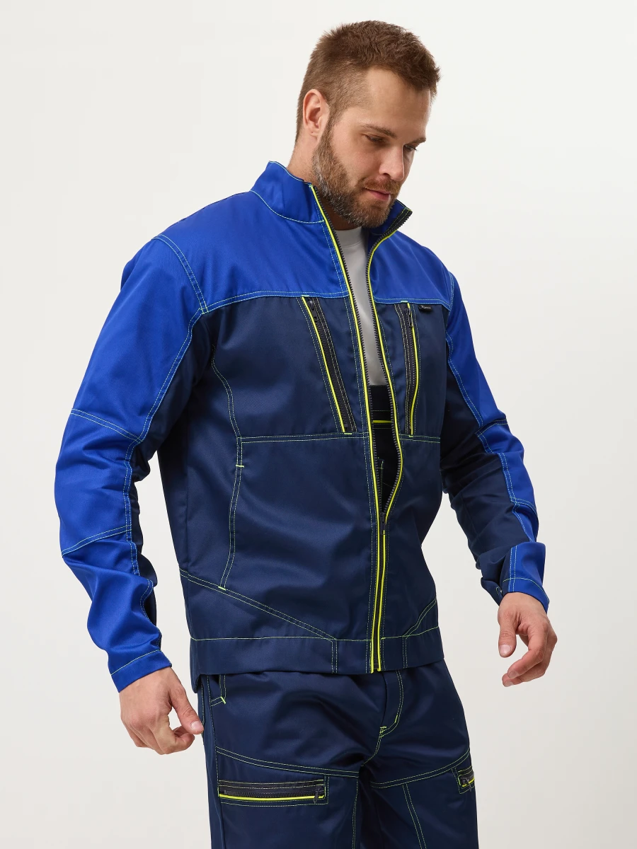 Куртка - центральная застежка на молнию-трактор - воротник стойка - 2 нижних боковых кармана, 2 нагрудных с боковым входом и застежкой на молнию трактор - по верху полочек и спинки кокетки - спинка с фигурным низом - эргономичные комбинированные рукава с застежкой на металлические кнопки. Настрочные налокотники с вытачками - лимонный светоотражающий кант вдоль центральной молнии, молний верхних карманов и нижней кокетки спинки - все участки, подверженные нагрузке, усилены закрепками Ткань: состав 35% хл. 65% пэ, плотность: 240 г/м2, пропитка ВО Цвет: васильковый,синий
