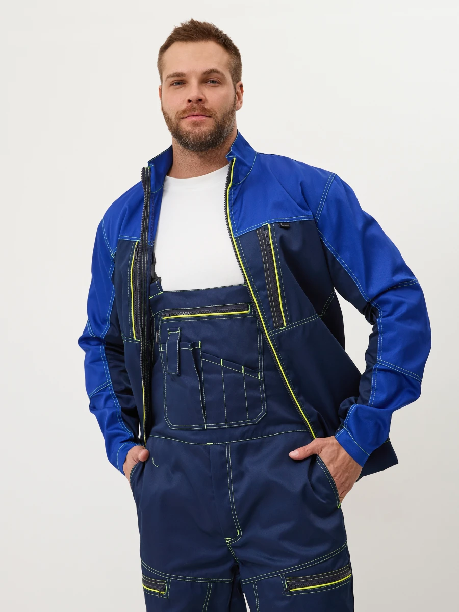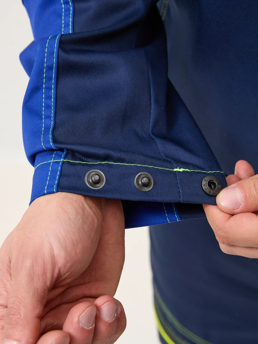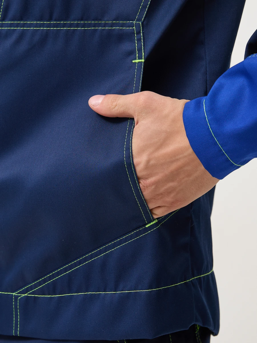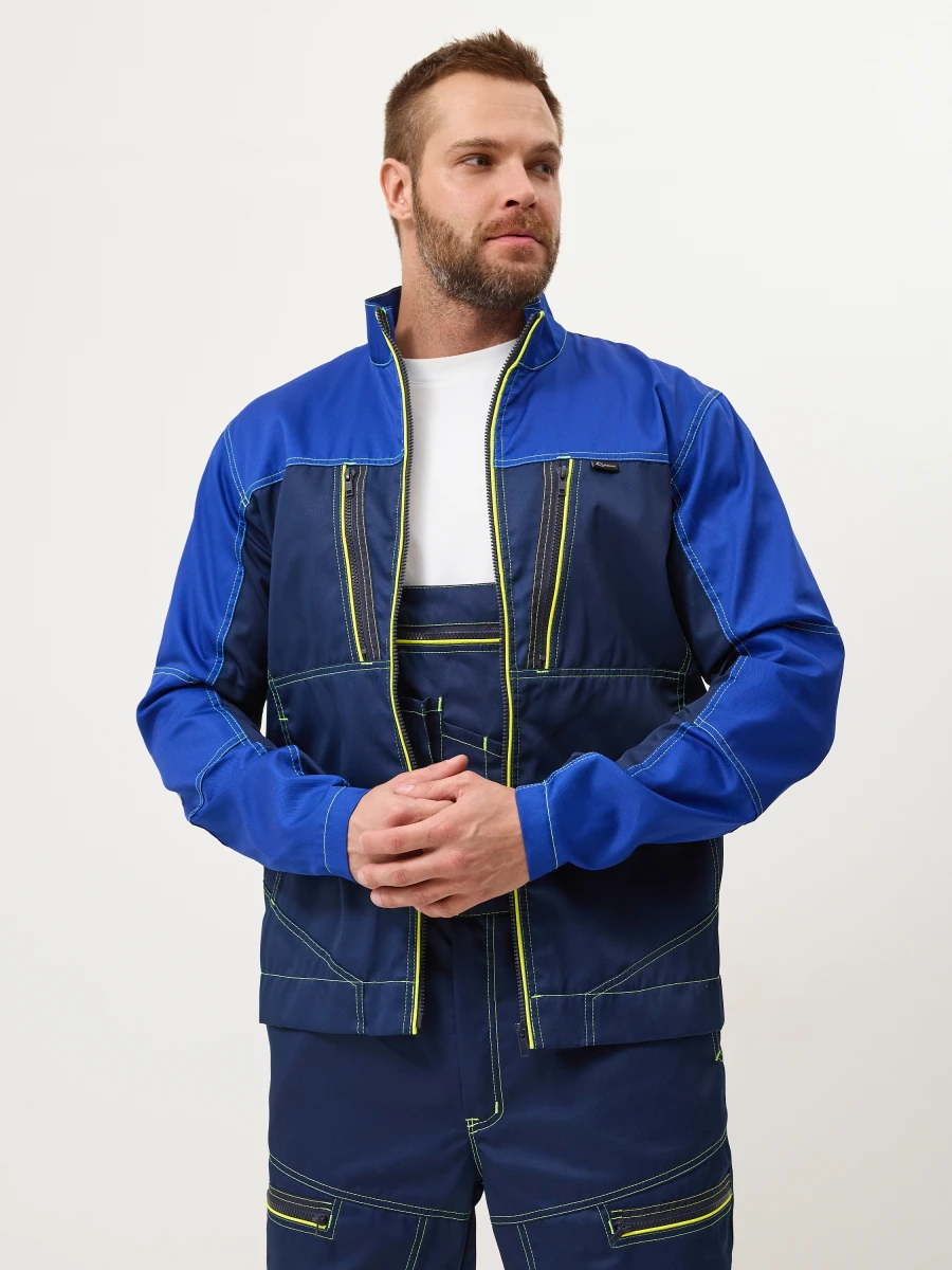 Куртка - центральная застежка на молнию-трактор - воротник стойка - 2 нижних боковых кармана, 2 нагрудных с боковым входом и застежкой на молнию трактор - по верху полочек и спинки кокетки - спинка с фигурным низом - эргономичные комбинированные рукава с застежкой на металлические кнопки. Настрочные налокотники с вытачками - лимонный светоотражающий кант вдоль центральной молнии, молний верхних карманов и нижней кокетки спинки - все участки, подверженные нагрузке, усилены закрепками Ткань: состав 35% хл. 65% пэ, плотность: 240 г/м2, пропитка ВО Цвет: васильковый,синий