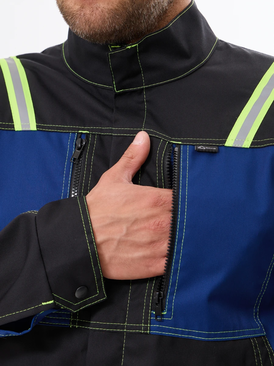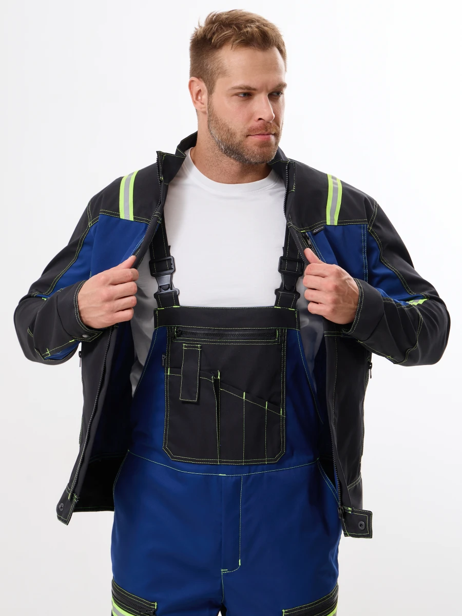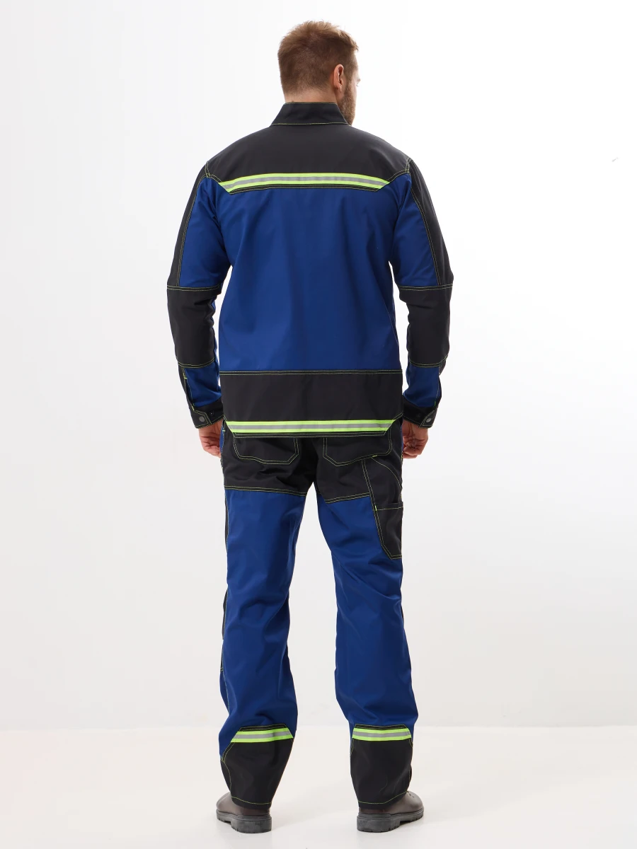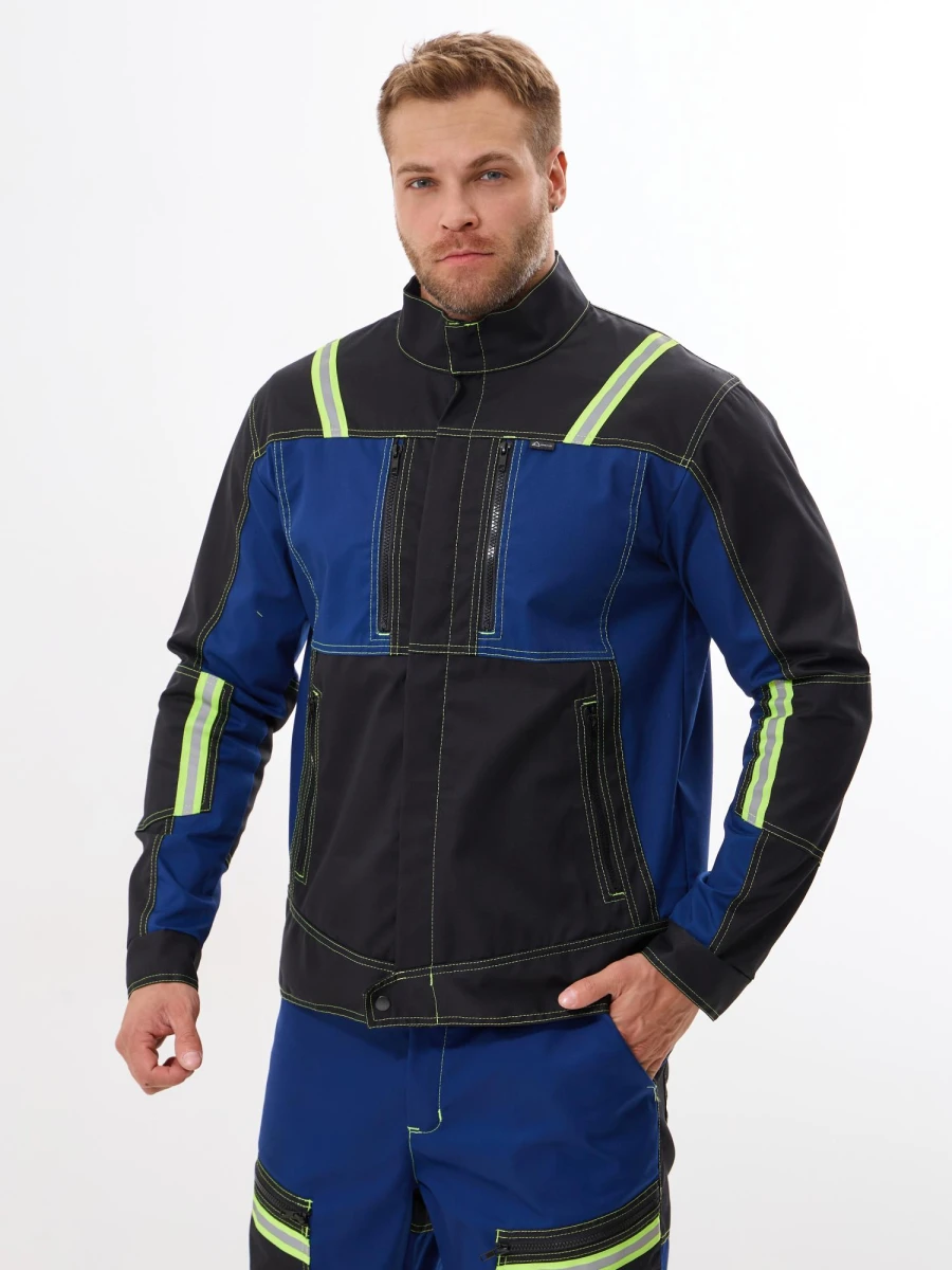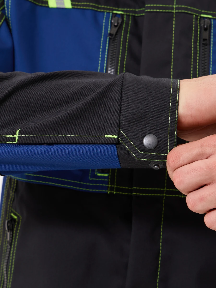 куртка - центральная застежка на молнию-трактор прикрыта цельнокроеной планкой - воротник стойка - 2 нижних боковых карман и 2 нагрудных с застежкой на молнию-трактор - фигурный низ куртки с расширением сзади и застежкой спереди на металлическую кнопку - по верху полочек и спинки кокетки - рукава с настрочными налокотниками - низ рукавов с манжетами и регулируемой застежкой на металлические кнопки - по кокеткам полочек, кокетке и низу спинки и на налокотниках, комбинированная светоотражающая полоса лимонно-серого цвета - все участки, подверженные нагрузке, усилены закрепками Ткань: состав 35% хл.65% пэ, плотность: 250 г/м2, пропитка ВО Цвет: синий с черным