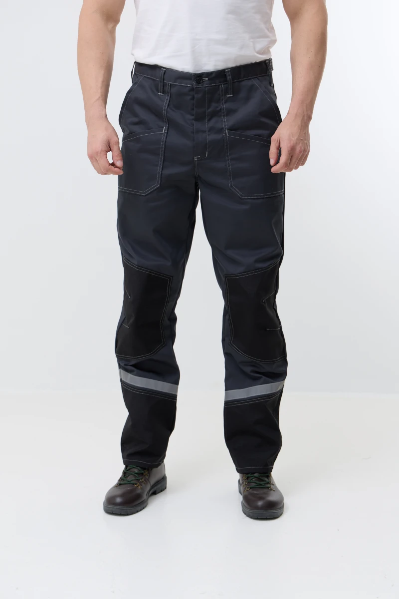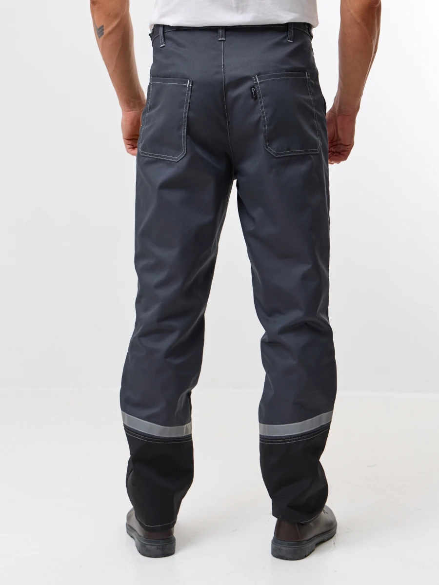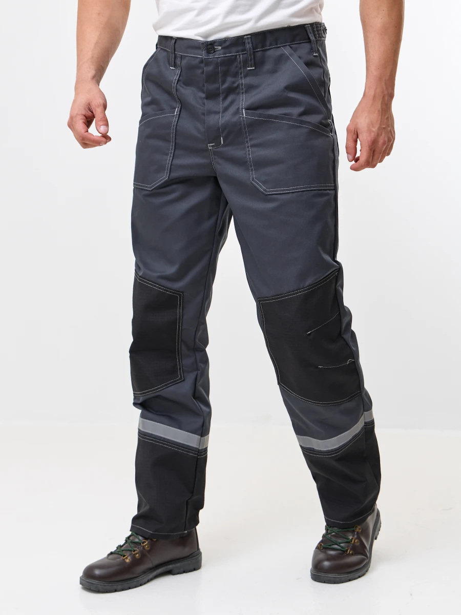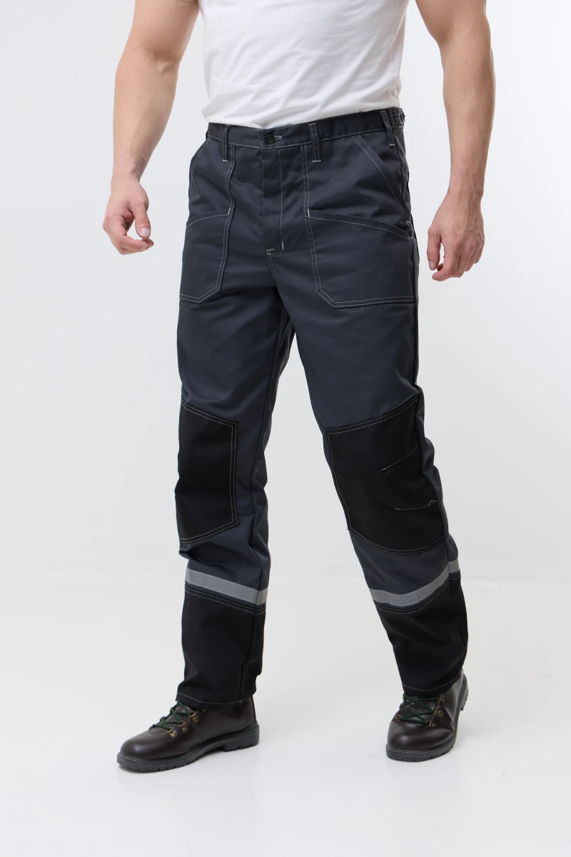 Брюки: - гульфик с молнией- удобные боковые настрочные карманы- задний правый настрочной карман- пояс с шлевками и регулировкой по объему на пуговицы. Передняя застежка на пуговицу- эргономические настрочные наколенники из прочной ткани рип-стоп- под наколенниками по кругу светоотражающая полоса ш.25 мм.- низ брючин по периметру из прочной ткани рип-стоп- все участки, подверженные нагрузке, усилены закрепкамиТкань: состав 35% хл.,65% пэ., плотность: 235 г/м2, пропитка ВО