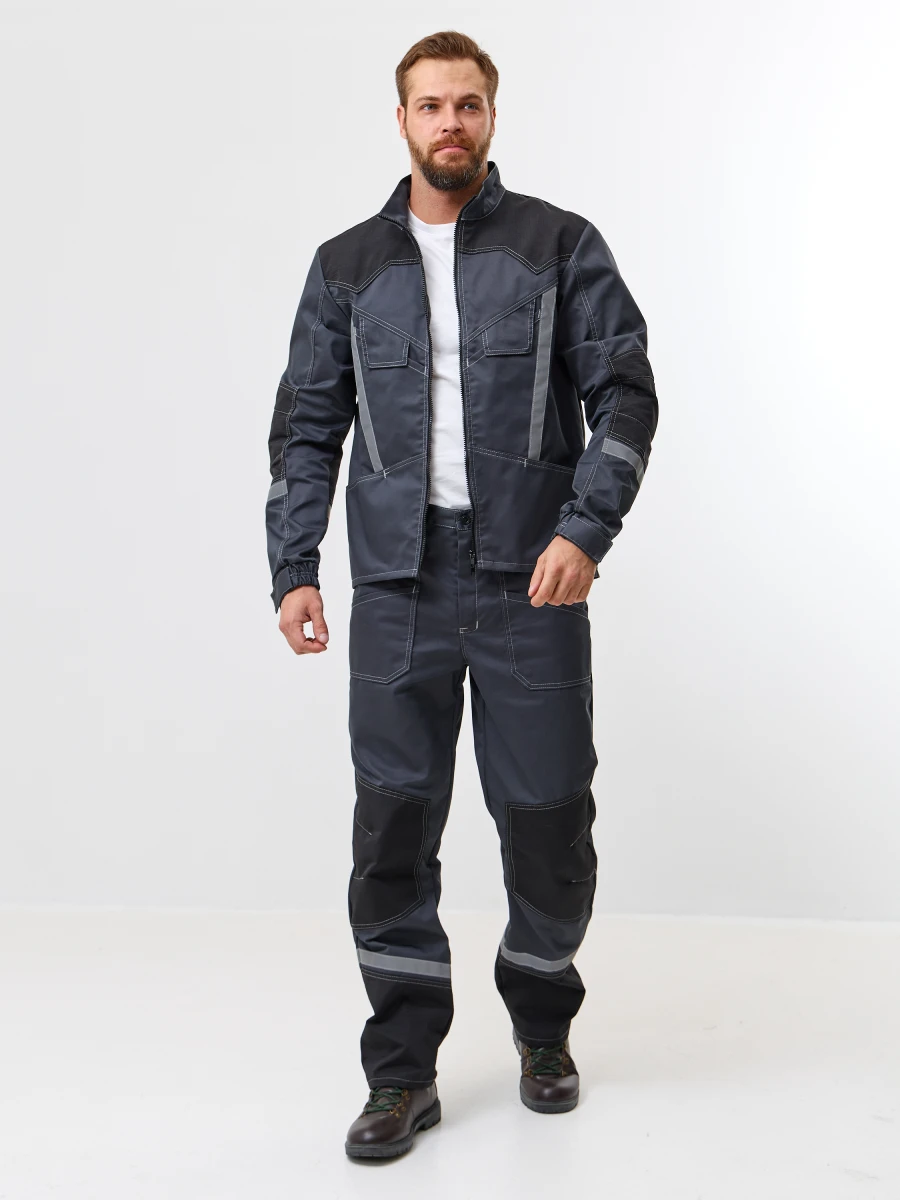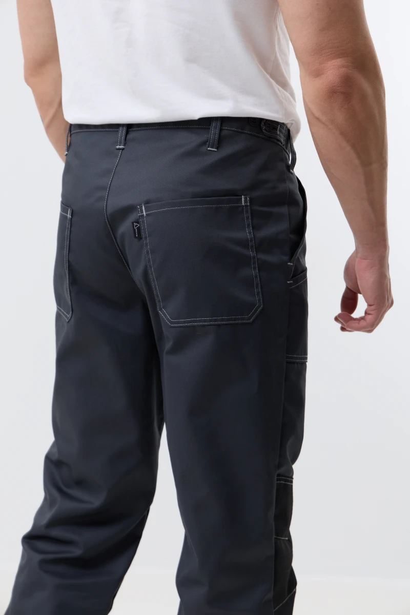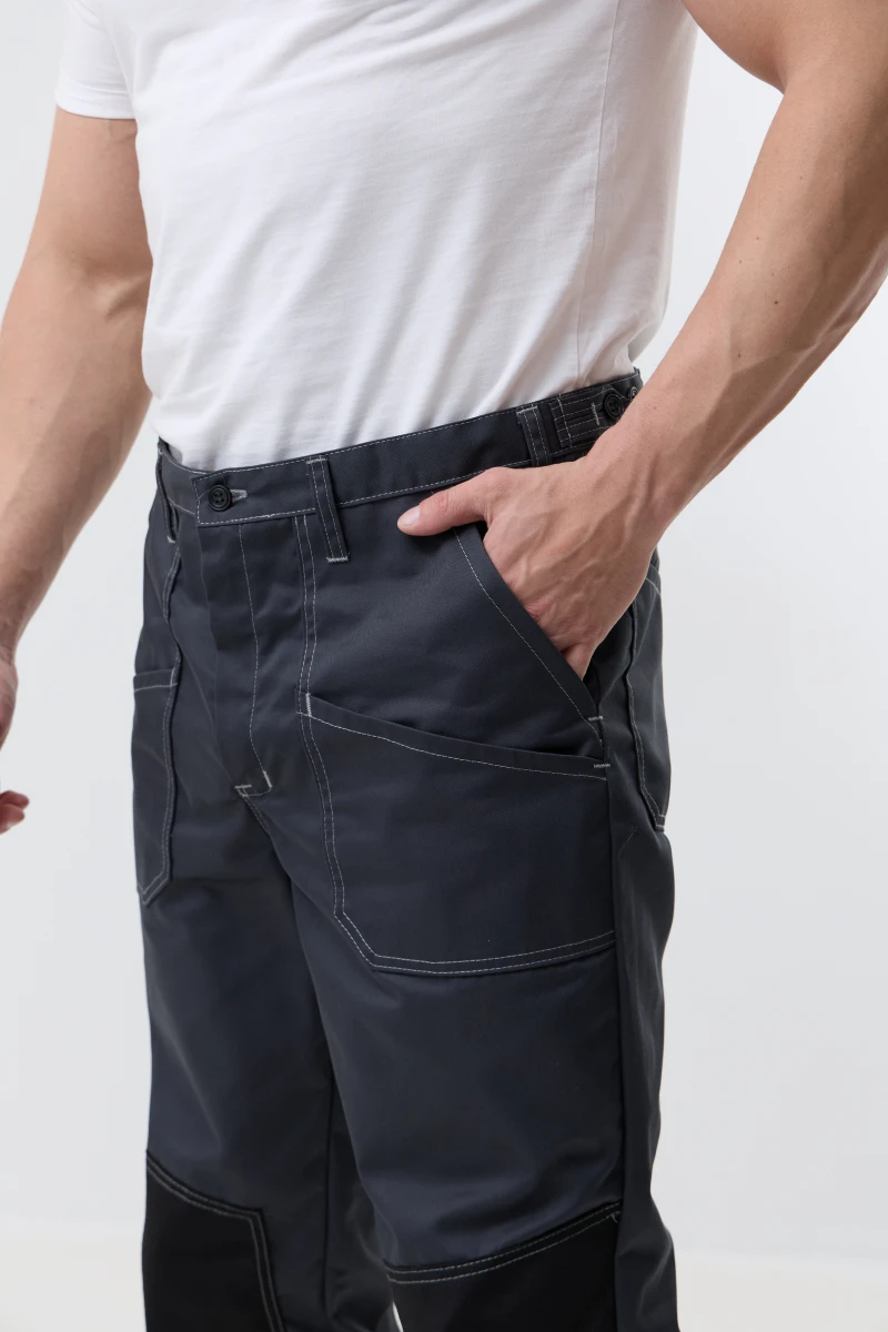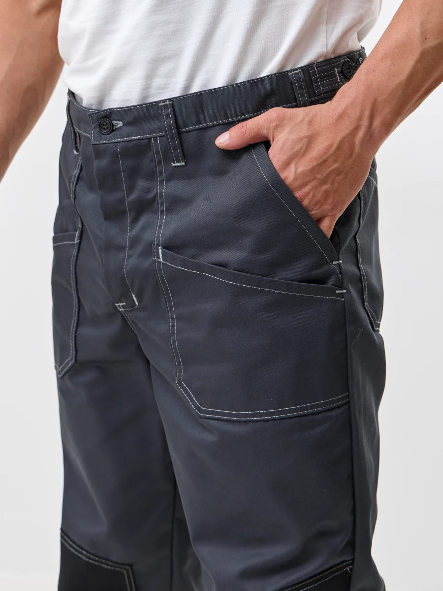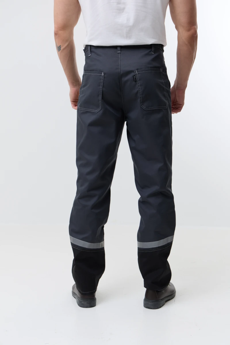 Брюки: - гульфик с молнией- удобные боковые настрочные карманы- задний правый настрочной карман- пояс с шлевками и регулировкой по объему на пуговицы. Передняя застежка на пуговицу- эргономические настрочные наколенники из прочной ткани рип-стоп- под наколенниками по кругу светоотражающая полоса ш.25 мм.- низ брючин по периметру из прочной ткани рип-стоп- все участки, подверженные нагрузке, усилены закрепкамиТкань: состав 35% хл.,65% пэ., плотность: 235 г/м2, пропитка ВО