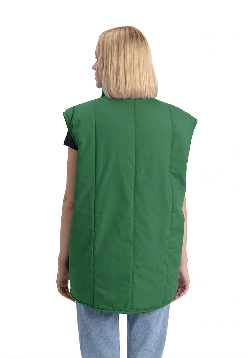 Жилет утепленный, с центральной застежкой на тракторную молнию, полочки и спинка простеганы с утеплителем вертикальными строчками. Воротник – стойка. В нижней части полочек - объемные накладные карманы, срезы которых уходят в боковые и нижние швы. Спинка жилета удлиненная.