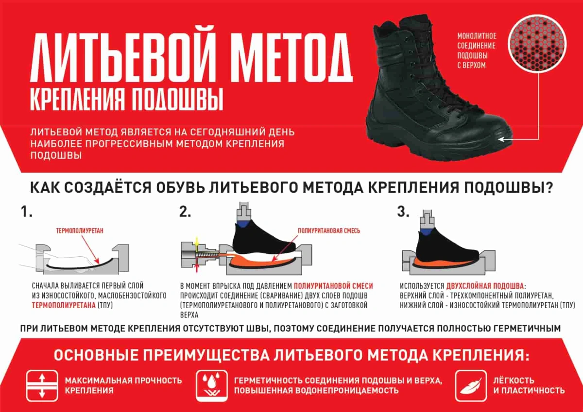 • Литьевой метод крепления подошвы образует с верхом обуви единое целое, в результате достигается полная герметичность и максимальная прочность обуви.