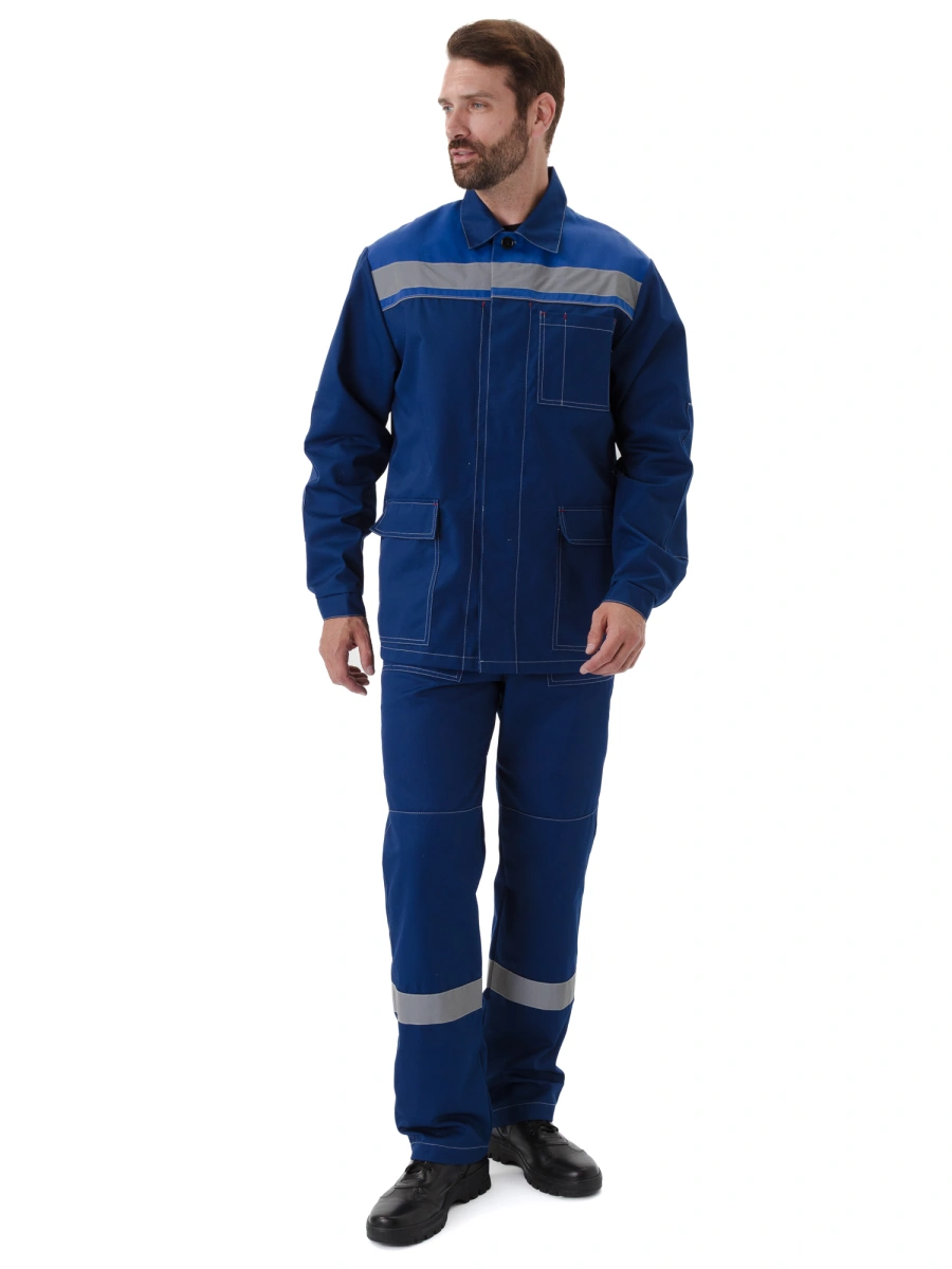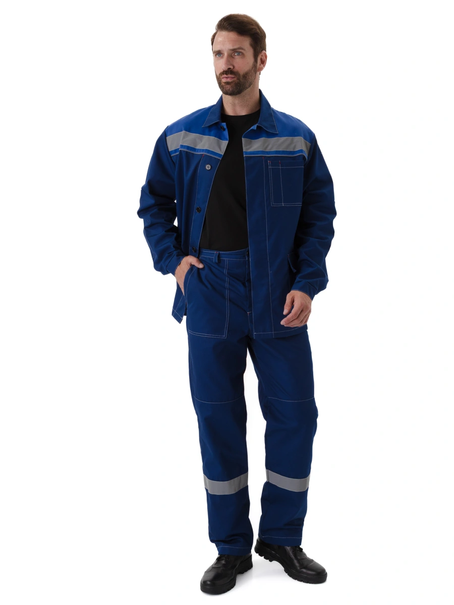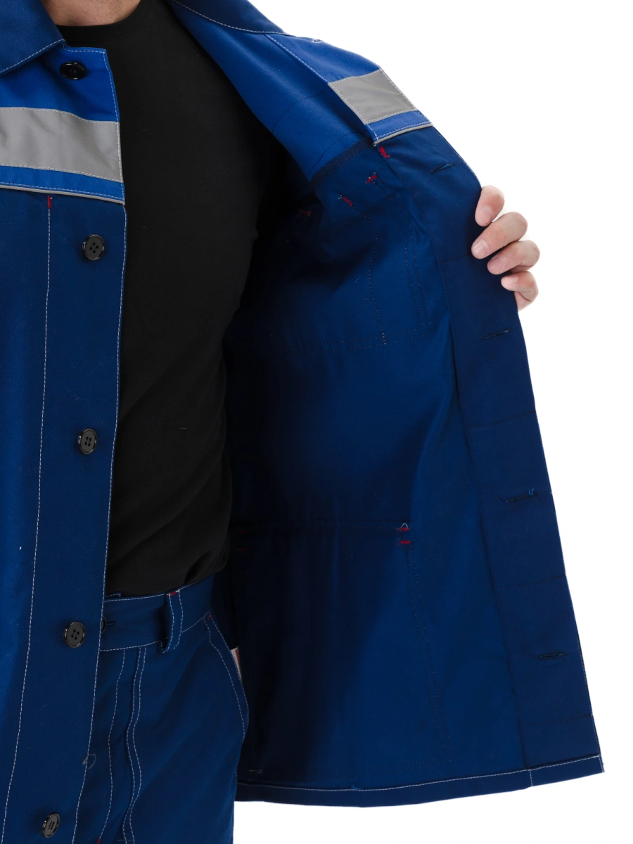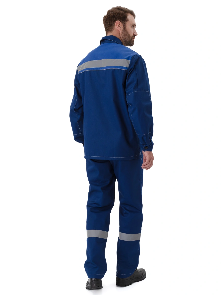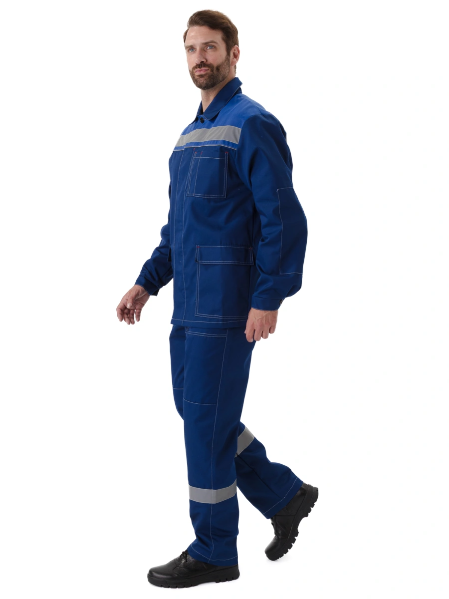 Костюм мужской летний, состоит из куртки и брюк. Куртка прямого силуэта – центральная супатная застежка на пуговицы, отложной воротник, кокетка полочек и спинки выделены светоотражающим кантом и широкой лентой СОП, нагрудный накладной карман на левой полочке, нижние накладные карманы с клапанами, рукав на притачной манжете с застежкой на пуговицу, усилительные накладки в области локтя. Брюки прямые, с притачным поясом со шлевками для дополнительного применения ремня, центральная застежка гульфик на петли и пуговицы верхние накладные карманы с косым входом, в нижней части брюк широкая лента СОП.