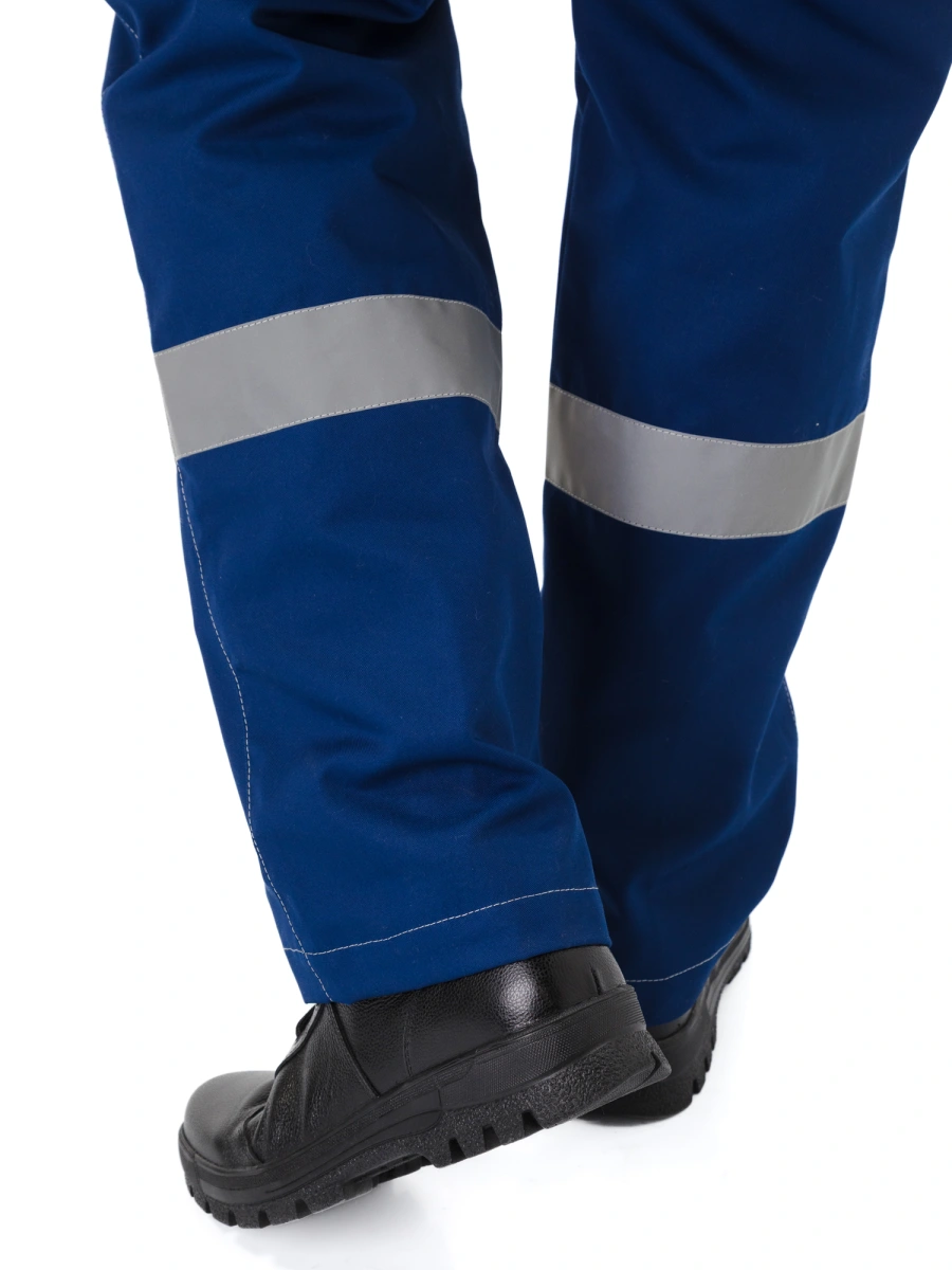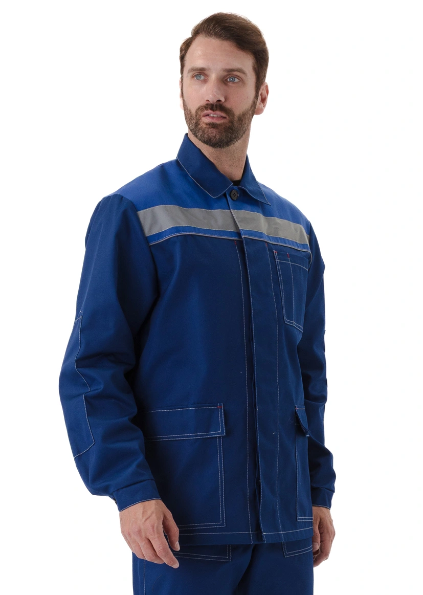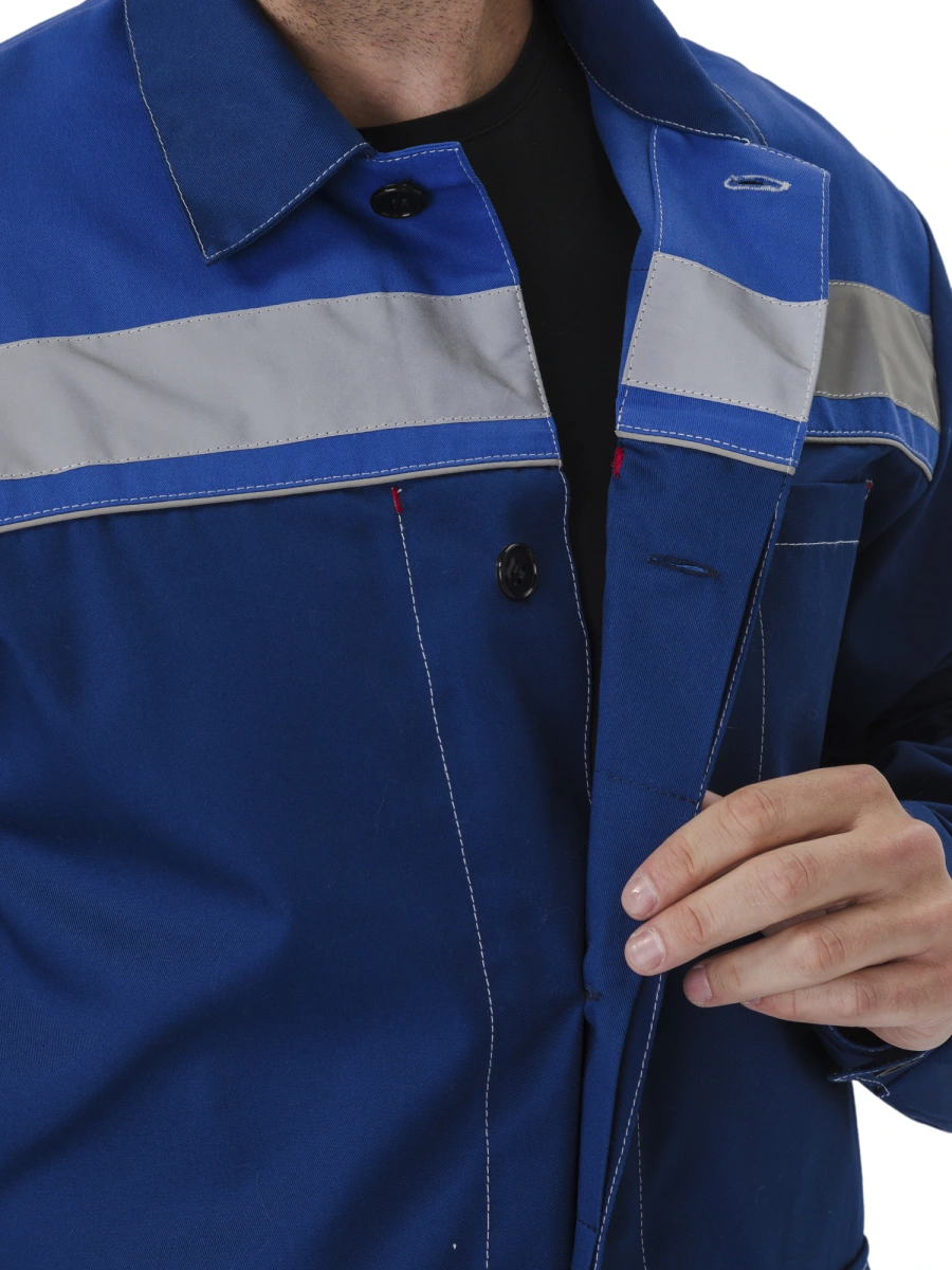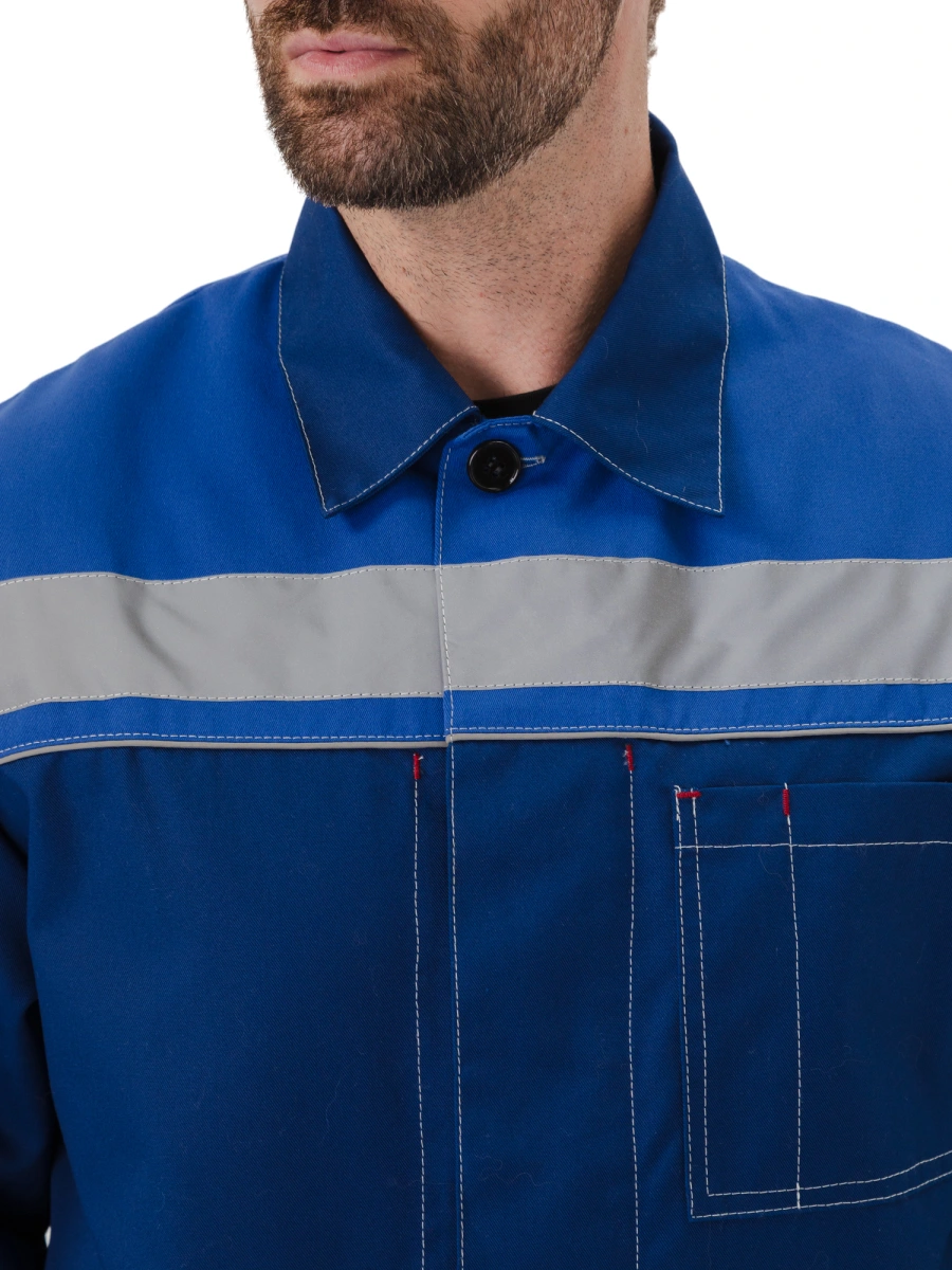 Костюм мужской летний, состоит из куртки и брюк. Куртка прямого силуэта – центральная супатная застежка на пуговицы, отложной воротник, кокетка полочек и спинки выделены светоотражающим кантом и широкой лентой СОП, нагрудный накладной карман на левой полочке, нижние накладные карманы с клапанами, рукав на притачной манжете с застежкой на пуговицу, усилительные накладки в области локтя. Брюки прямые, с притачным поясом со шлевками для дополнительного применения ремня, центральная застежка гульфик на петли и пуговицы верхние накладные карманы с косым входом, в нижней части брюк широкая лента СОП.
