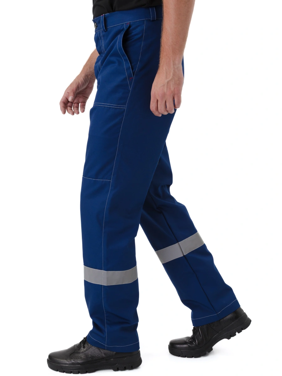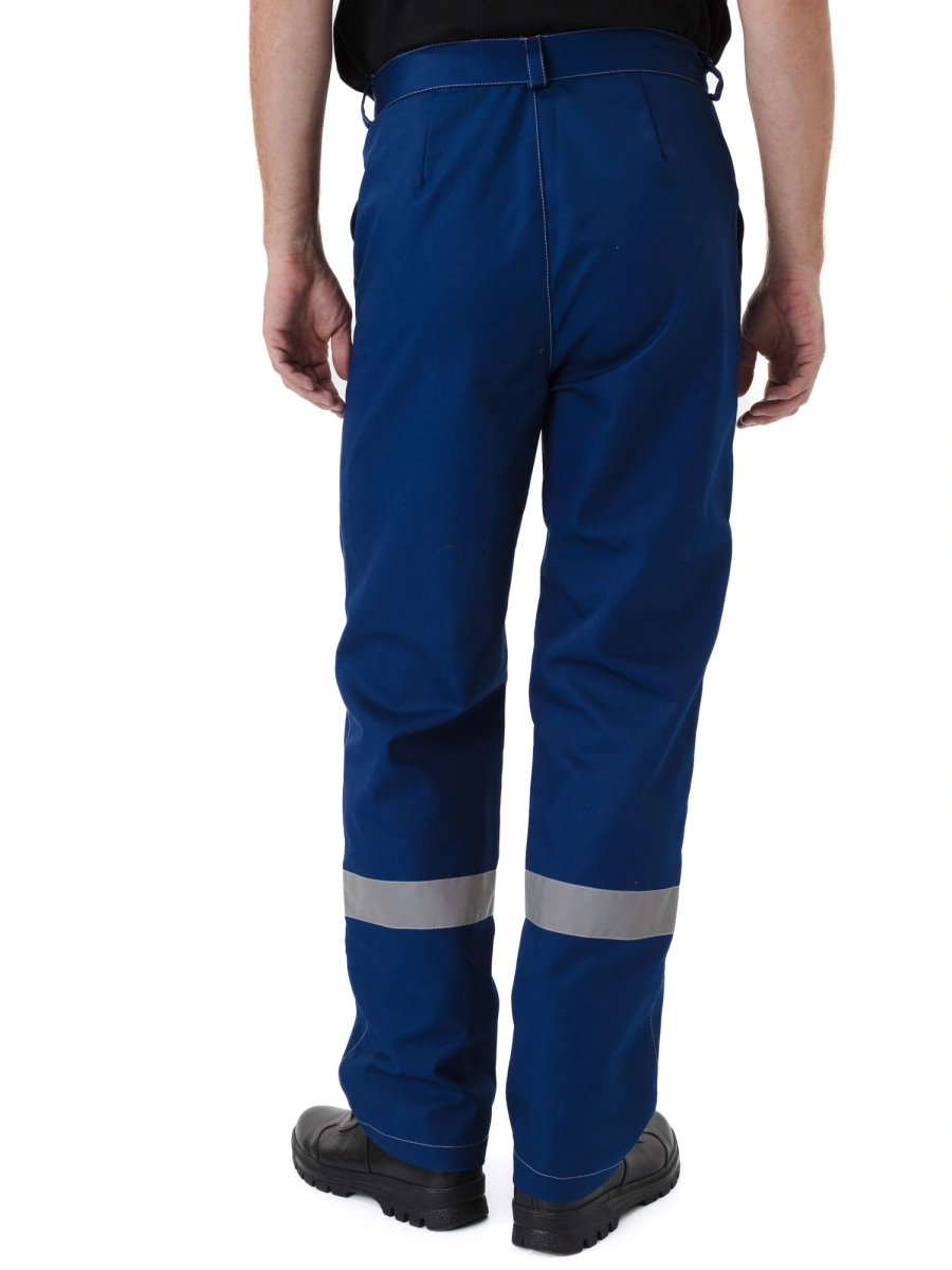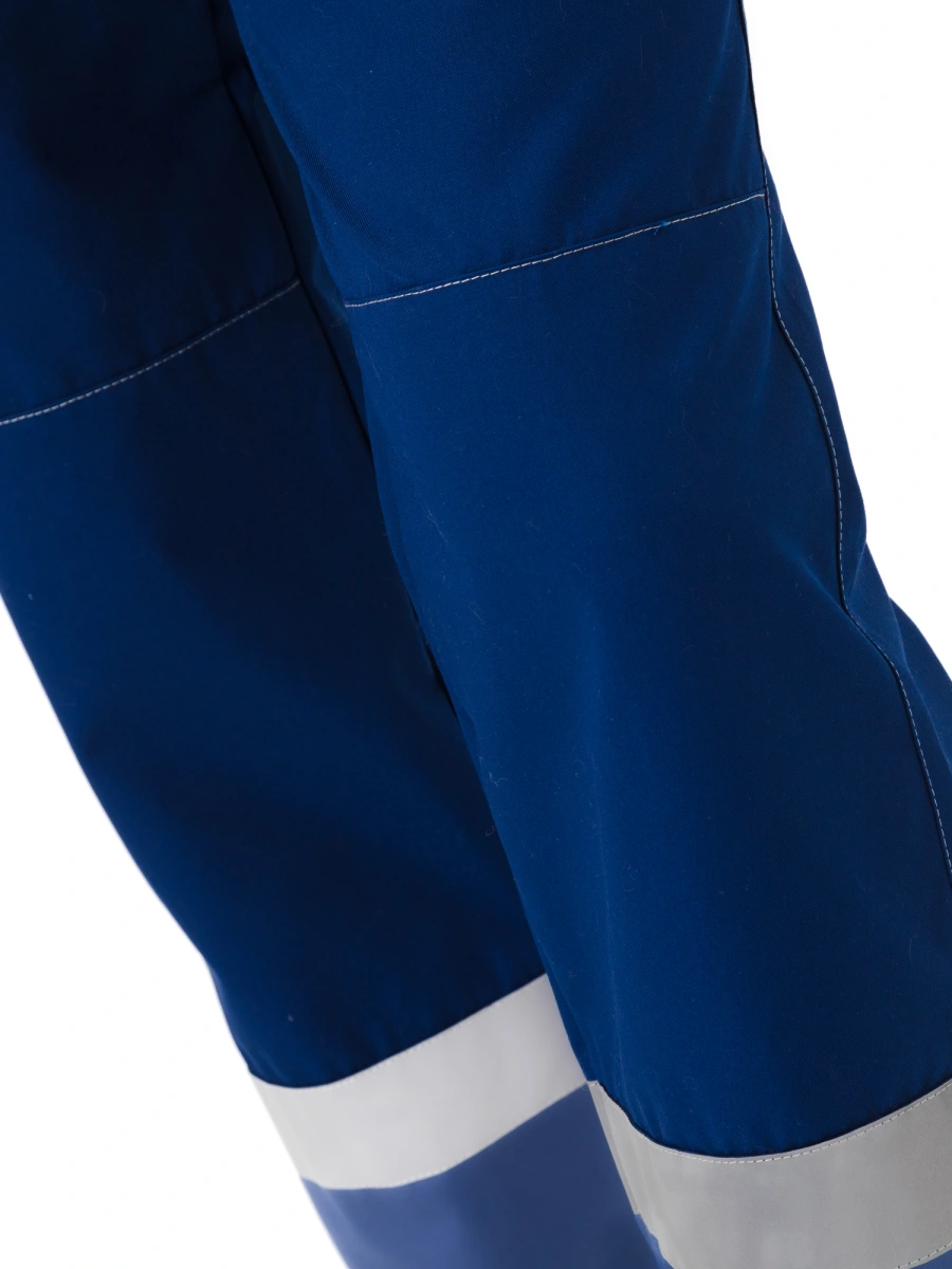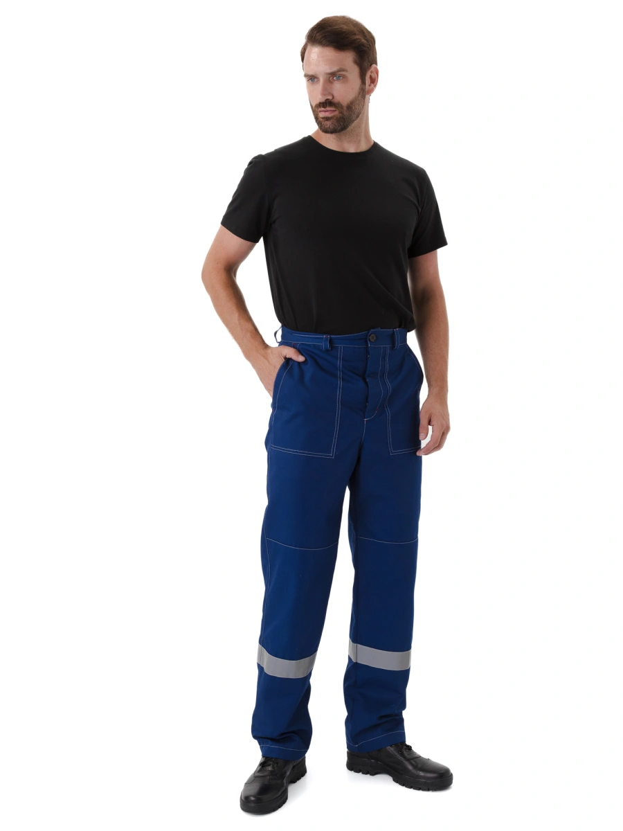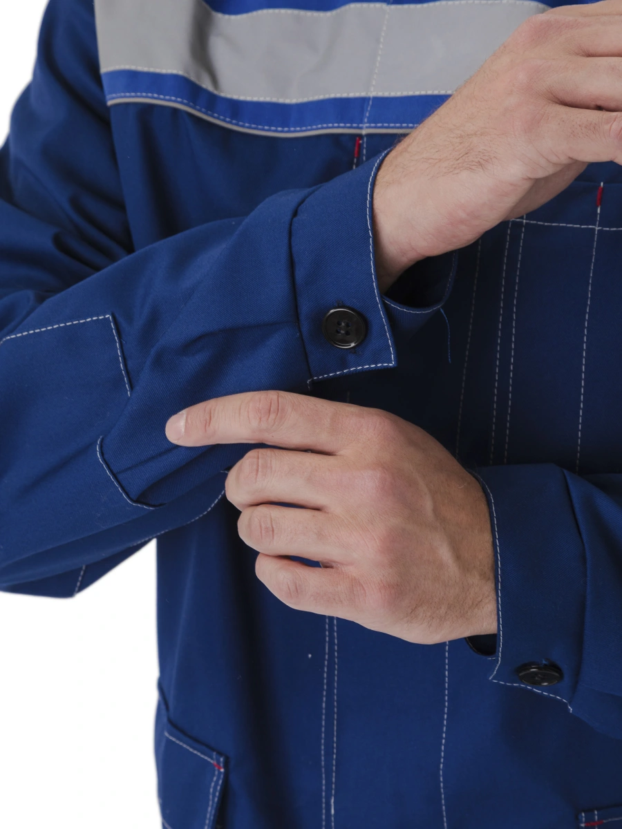Костюм мужской летний, состоит из куртки и брюк. Куртка прямого силуэта – центральная супатная застежка на пуговицы, отложной воротник, кокетка полочек и спинки выделены светоотражающим кантом и широкой лентой СОП, нагрудный накладной карман на левой полочке, нижние накладные карманы с клапанами, рукав на притачной манжете с застежкой на пуговицу, усилительные накладки в области локтя. Брюки прямые, с притачным поясом со шлевками для дополнительного применения ремня, центральная застежка гульфик на петли и пуговицы верхние накладные карманы с косым входом, в нижней части брюк широкая лента СОП.
