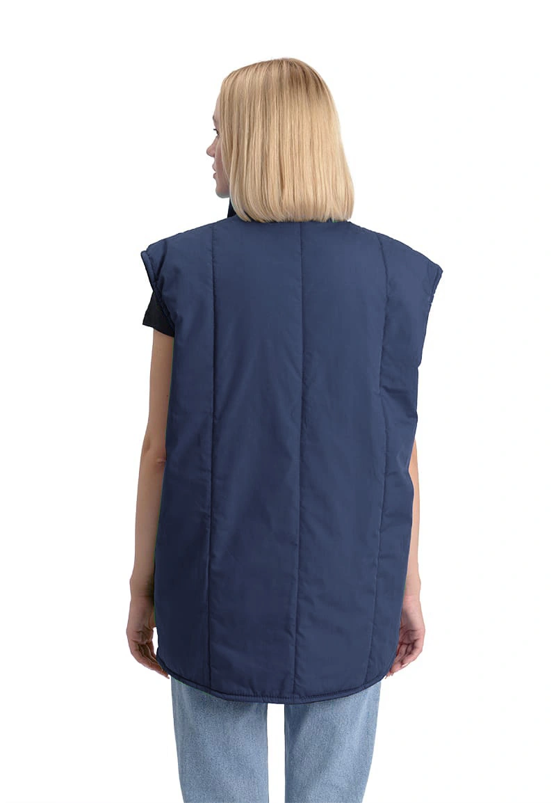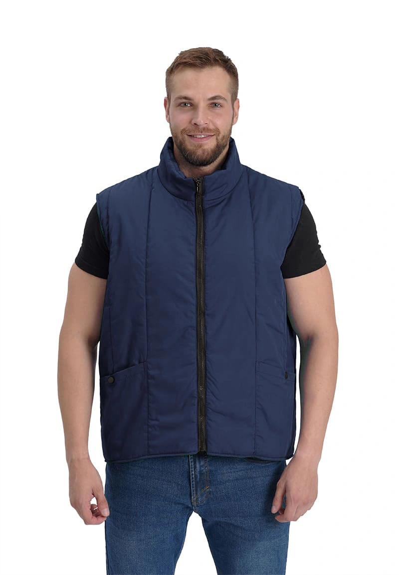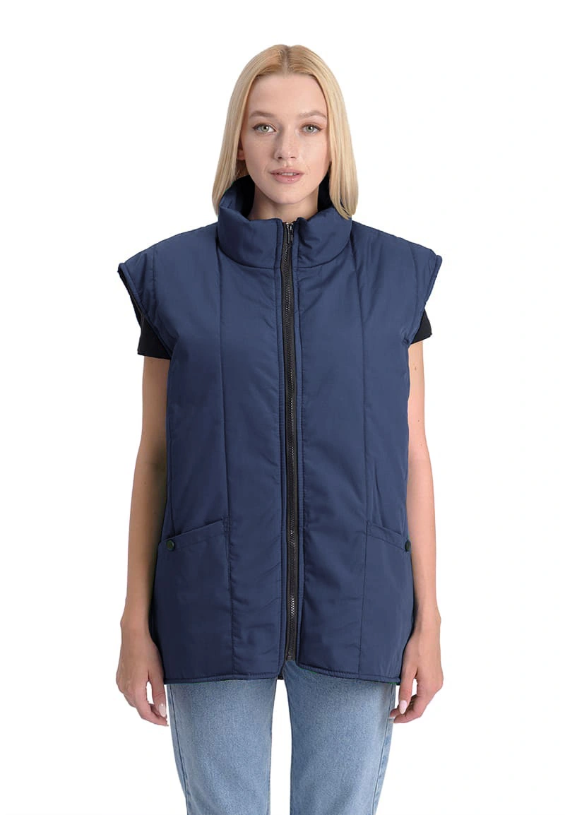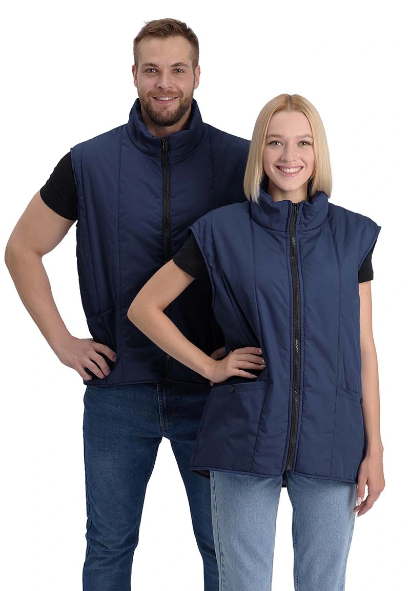 Жилет утепленный, с центральной застежкой на тракторную молнию, полочки и спинка простеганы с утеплителем вертикальными строчками. Воротник – стойка. В нижней части полочек - объемные накладные карманы, срезы которых уходят в боковые и нижние швы. Спинка жилета удлиненная.