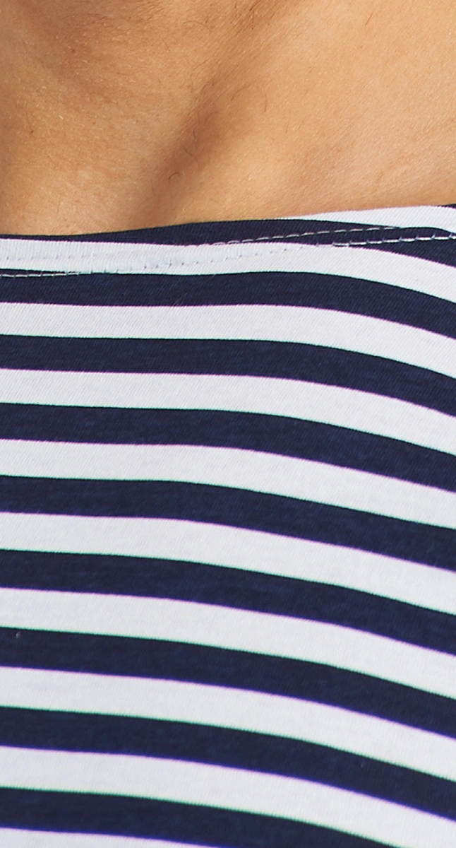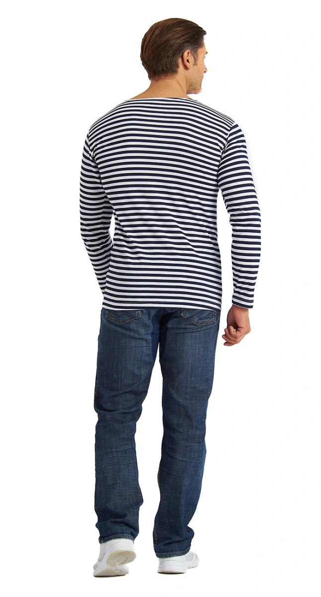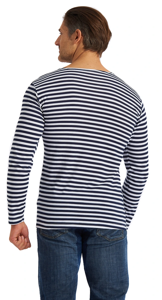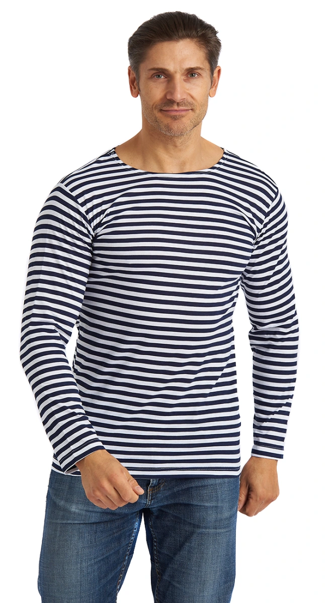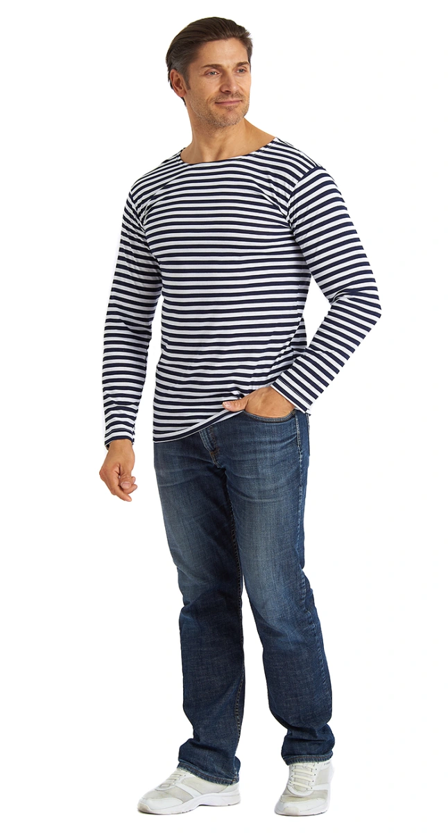 Летняя тельняшка-флотская нательная фуфайка с длинными рукавами и темно-синими полосками.